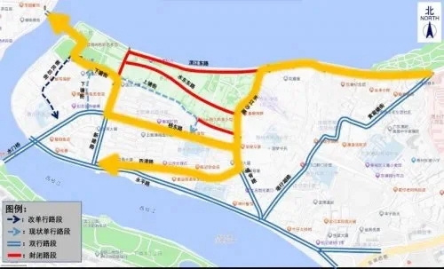 。ǘI江東路/黃家塘街交叉口至濱江東路/東江沙路交叉口路段,調(diào)整為車輛東往西單向通行。