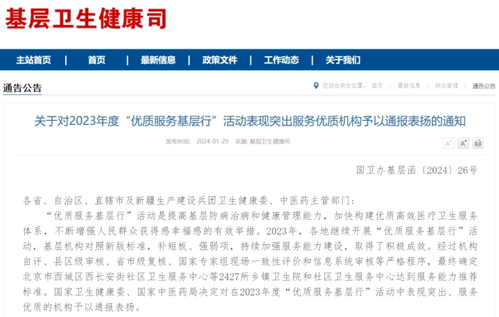 國家衛(wèi)生健康委表示,希望受到表揚的機構(gòu)珍惜榮譽,再接再厲、再創(chuàng)佳績。各級衛(wèi)生健康行政部門、中醫(yī)藥主管部門要提高政治站位,繼續(xù)深入開展“優(yōu)質(zhì)服務(wù)基層行”活動,立足提供全方位全周期的基本醫(yī)療衛(wèi)生服務(wù),持續(xù)提升服務(wù)能力,不斷提高服務(wù)質(zhì)量,為全面推進健康中國建設(shè)和鄉(xiāng)村振興作出新的更大貢獻。