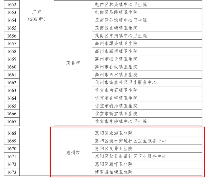 通知指出,國家衛(wèi)生健康委、國家中醫(yī)藥局決定對在2023年度“優(yōu)質(zhì)服務(wù)基層行”活動中表現(xiàn)突出、服務(wù)優(yōu)質(zhì)的機構(gòu)予以通報表揚。名單中,廣東有205家基層醫(yī)療機構(gòu)上榜,其中惠州市6家機構(gòu)入選,分別是惠陽區(qū)永湖衛(wèi)生院、惠陽區(qū)淡水街道社區(qū)衛(wèi)生服務(wù)中心、惠陽區(qū)良井衛(wèi)生院、惠陽區(qū)秋長街道社區(qū)衛(wèi)生服務(wù)中心、惠陽區(qū)新圩衛(wèi)生院、博羅縣柏塘衛(wèi)生院。