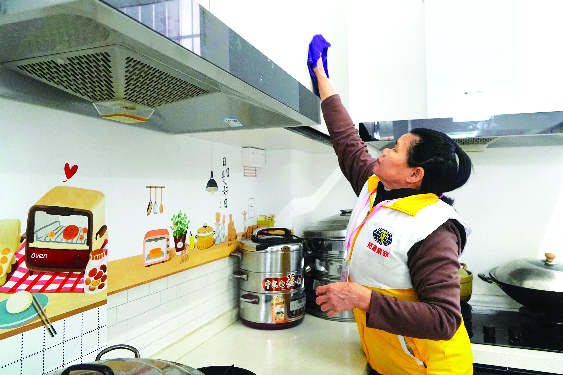 家政保潔員在客戶家清潔抽油煙機(jī)。