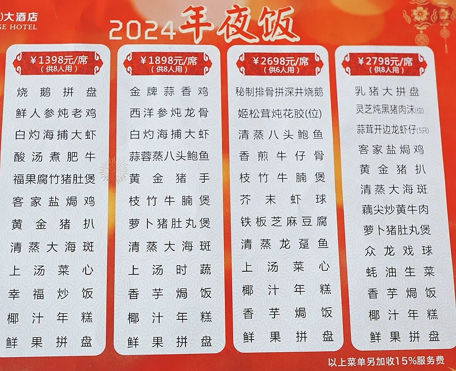 記者梳理發(fā)現(xiàn),餐飲酒店的年夜飯的價(jià)格從幾百元到數(shù)千元不等,定價(jià)多與“6”“8”等吉利的數(shù)字相關(guān)。其中不少酒店都會(huì)標(biāo)注春節(jié)期間會(huì)全單加收10%~15%不等的服務(wù)費(fèi),酒店方面解釋,主要是春節(jié)假期人手緊張,人工價(jià)也相對(duì)較高,“我們都會(huì)和客人解釋清楚,大部分都能接受!