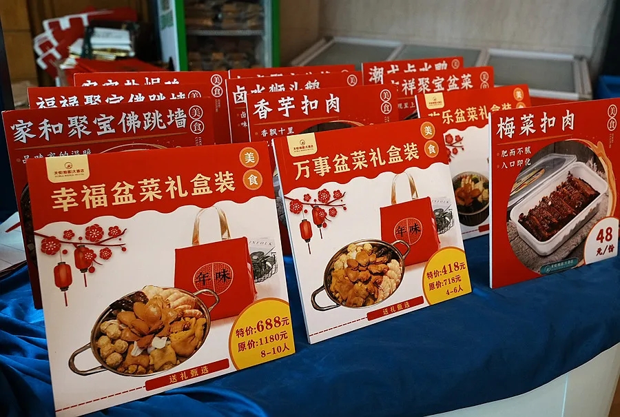 幸福盆菜禮盒、當(dāng)歸滋補(bǔ)家雞禮盒、福祿聚寶佛跳墻、梅菜扣肉……惠州天悅(嘉柏)大酒店在大堂辟出專區(qū),銷售各種盆菜和年夜飯?zhí)撞,有的單品價(jià)格低至幾十元,有的盆菜只需要200多元,實(shí)惠的價(jià)格頗受消費(fèi)者歡迎。“這些菜式都是用新鮮食材現(xiàn)做的,消費(fèi)者只需要提前4個(gè)小時(shí)預(yù)訂就行!睏铢i介紹,消費(fèi)者可以到店領(lǐng)取,也可以通過(guò)跑腿送貨上門,“回到家里只需加熱便可食用,非常方便,味道也幾乎和堂食差不多!