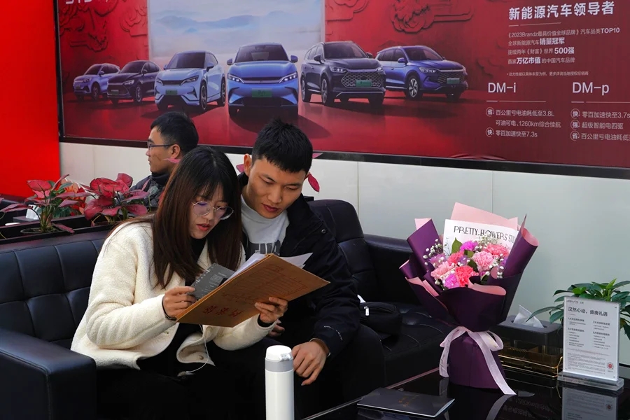 “春節(jié)前是傳統(tǒng)銷售旺季,廠商促銷力度大,疊加汽車金融的推廣,不少剛需市民都會選擇在這時出手,開新車回家過年!北葋喌贤醭W(wǎng)惠州惠迪4S店市場總監(jiān)張景龍表示,比亞迪廠商在春節(jié)前推出購車補貼優(yōu)惠,最高補貼3萬多元,2024年1月份店賣出了100多輛車,其中混動車型和純電車型銷量占比各一半。