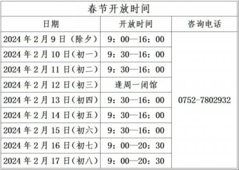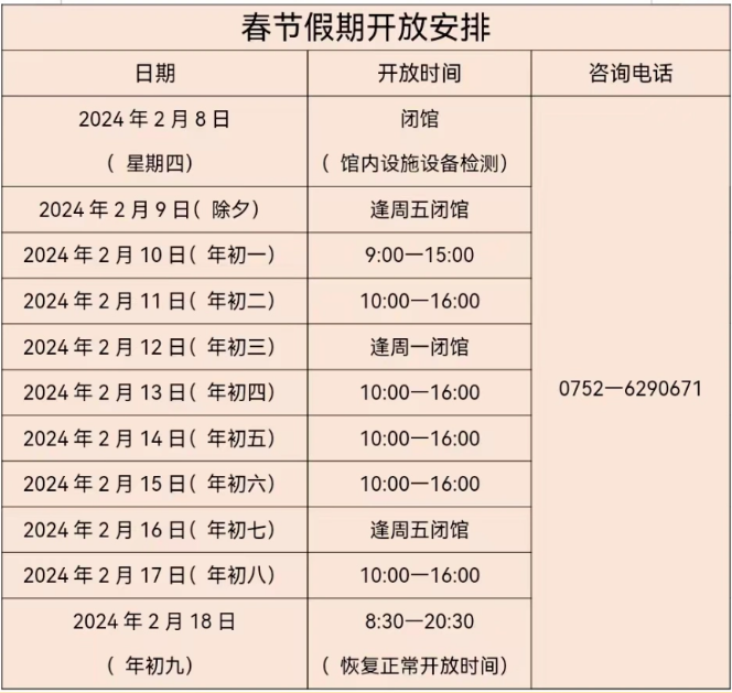根據(jù)《國(guó)務(wù)院辦公廳關(guān)于2024年部分節(jié)假日安排的通知》,結(jié)合工作實(shí)際,惠州科技館春節(jié)期間開館時(shí)間如下: