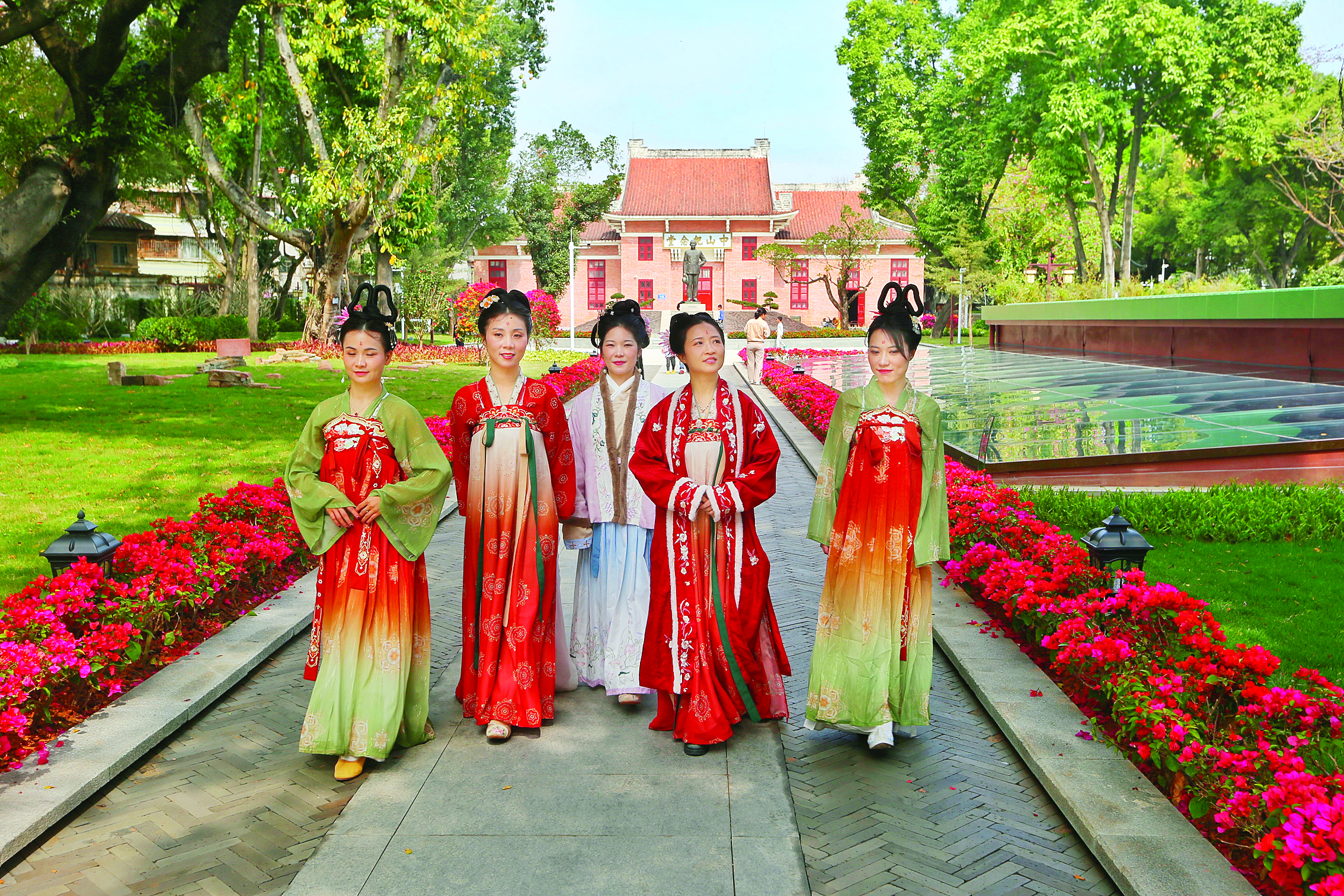 市民穿著古代(唐、宋)服裝來公園打卡。