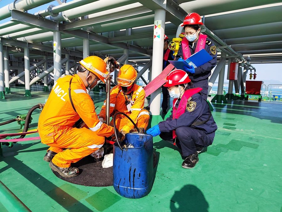 惠州港海關(guān)關(guān)員在馬鞭洲原油碼頭對進口原油進行取樣。 惠州日報記者劉煒煒 通訊員吳雨霏 攝