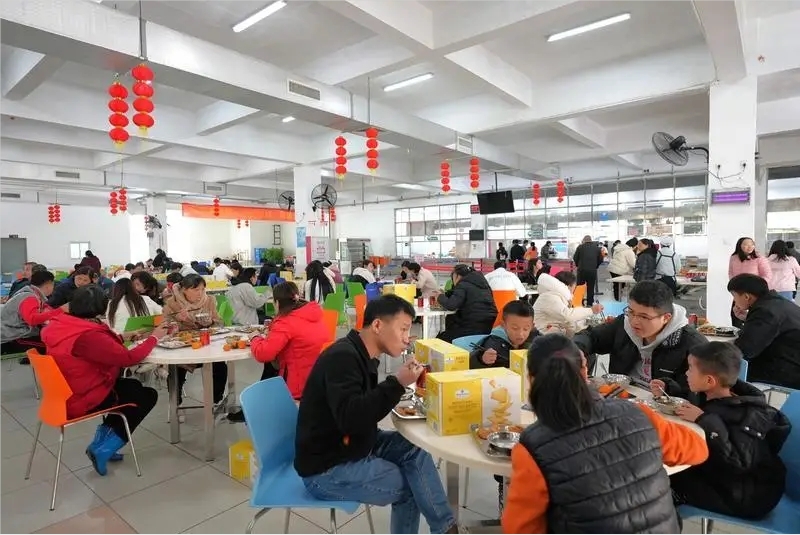 除夕中午,仲愷東江高新科技產(chǎn)業(yè)園相比往常冷清了不少,但華陽工業(yè)園A區(qū)飯?zhí)们皡s異常熱鬧,一陣歡呼聲拉開了工廠年夜飯的序幕。