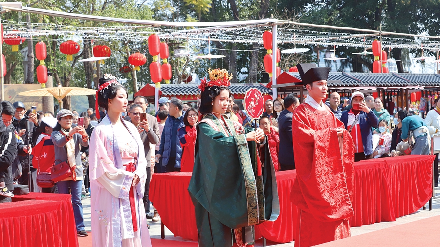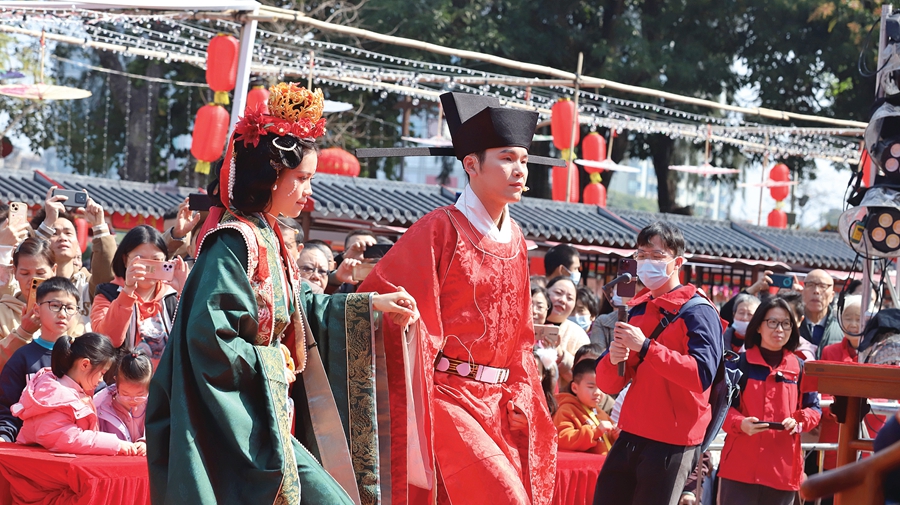 記者還發(fā)現(xiàn),不少外地游客也來(lái)打卡!斑@場(chǎng)‘宋式婚禮秀’還原了宋朝時(shí)期的結(jié)婚場(chǎng)景,既弘揚(yáng)了中國(guó)傳統(tǒng)文化,也營(yíng)造了春節(jié)喜慶氛圍。”從廈門(mén)來(lái)惠州過(guò)春節(jié)的游客沈雁飛大贊婚禮秀“很吸睛”“很新鮮”。沈雁飛告訴記者,他們一家人第一次來(lái)惠州,感覺(jué)很不錯(cuò),不僅氣候宜人、空氣清新,景色也很美,接下來(lái)幾天他們還打算到羅浮山游玩。