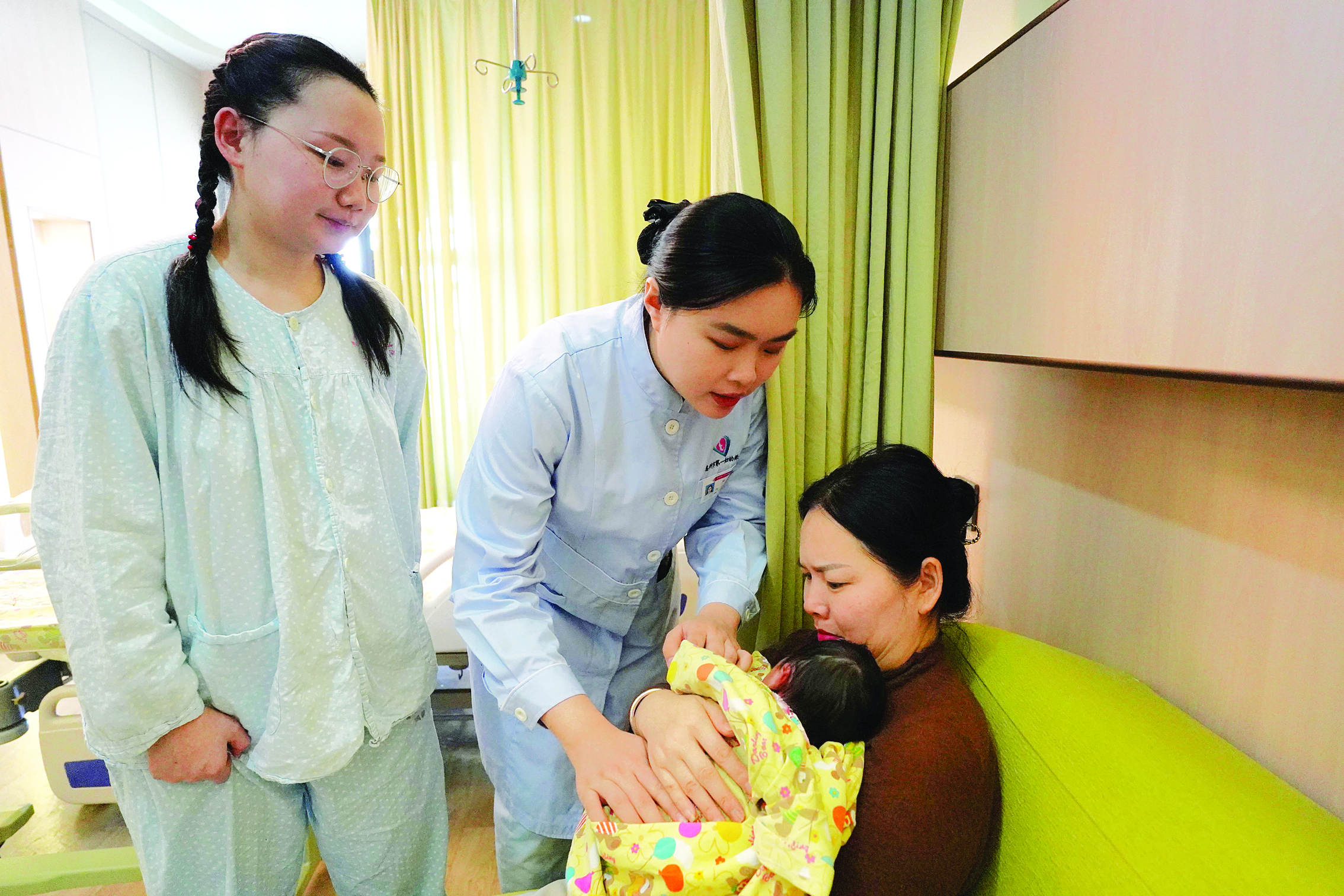醫(yī)護人員正在教龍寶寶的家人正確拍嗝;葜萑請笥浾咝ゃ 攝