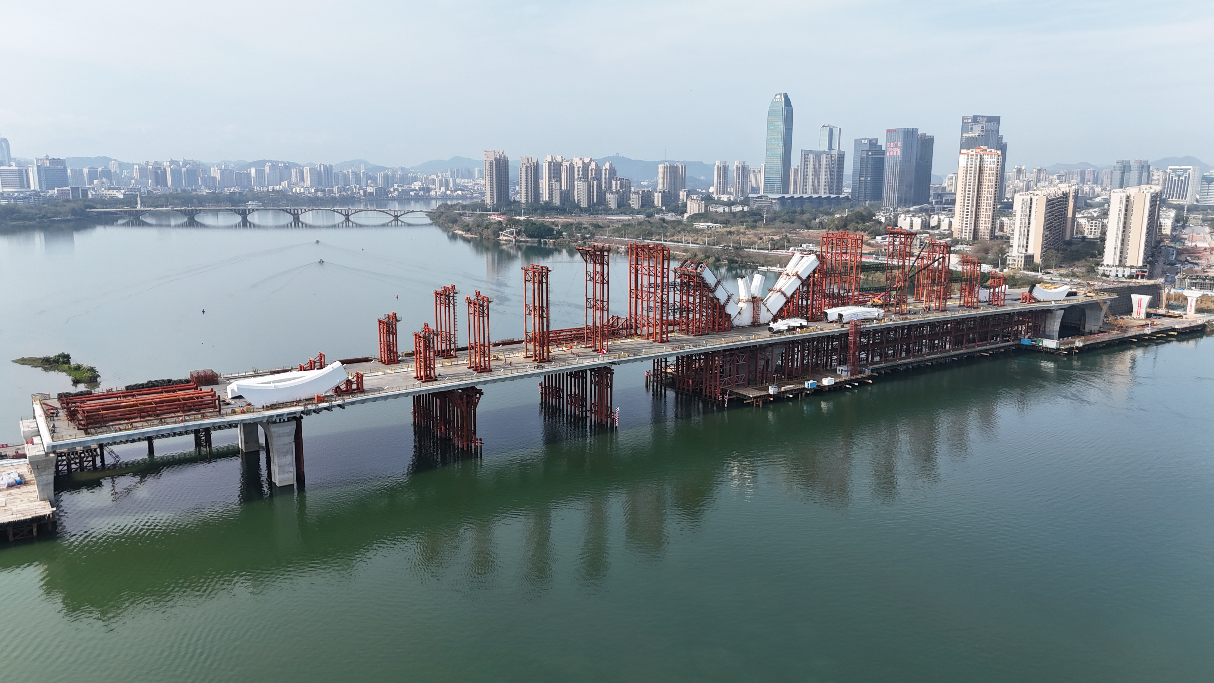 2月18日,鵝城大橋緊張施工中;葜萑請笥浾哏姇承 攝