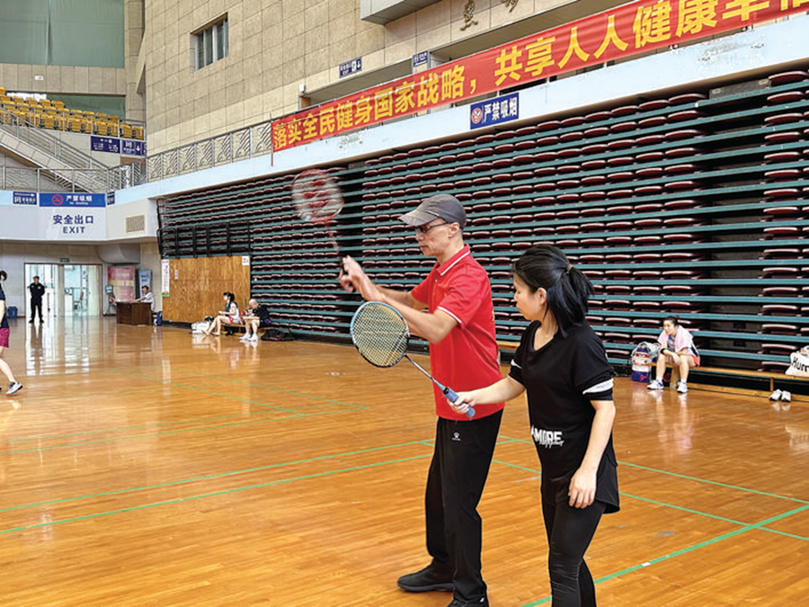 劉炎明(左)在教羽毛球愛好者打球。