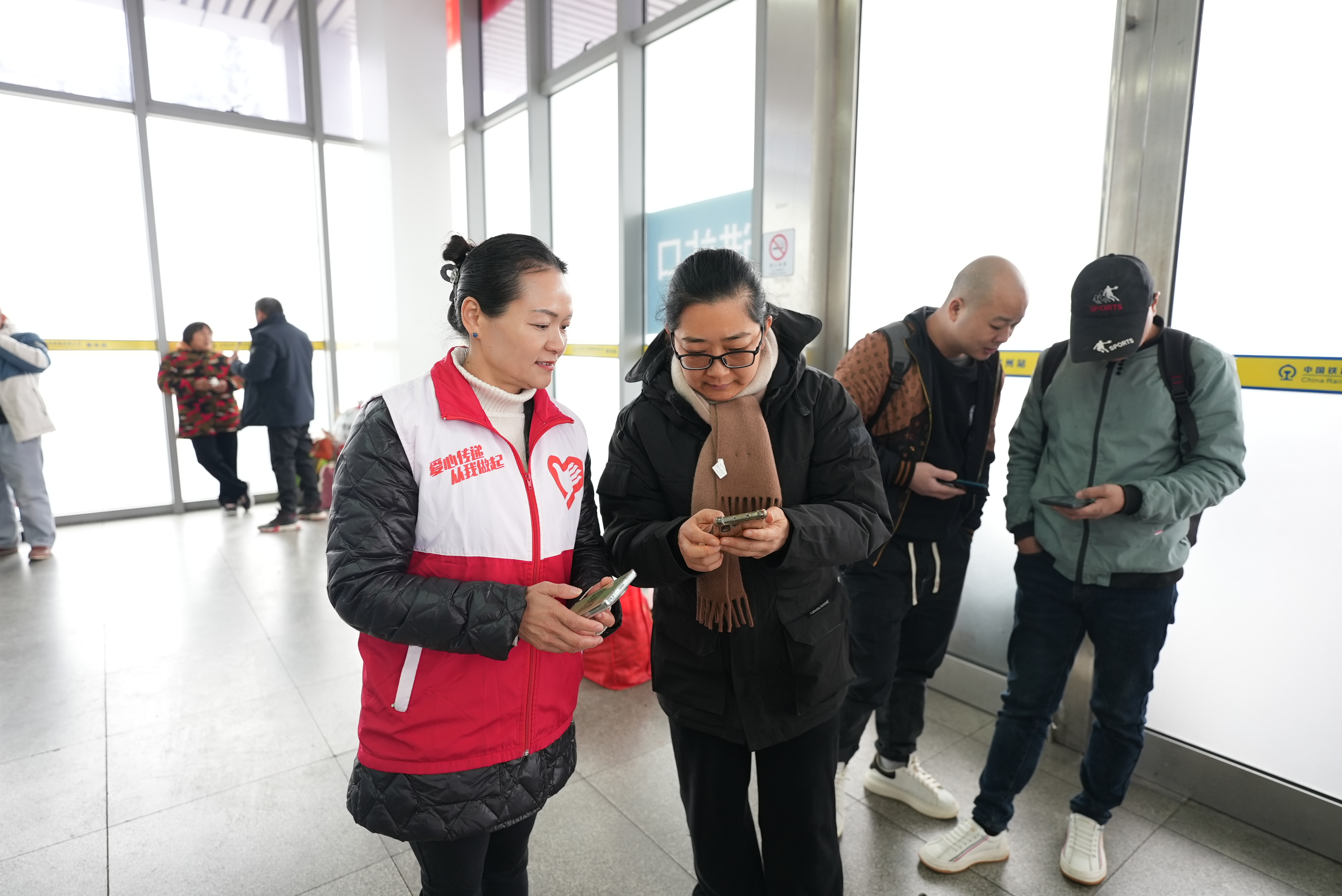 “阿姨,這個(gè)行李太重了,我們來幫你搬吧!薄鞍⑹,三號候車室要上二樓,您可以從這邊乘電梯!薄涨埃2024年惠州市志愿服務(wù)春運(yùn)“暖冬行動(dòng)”活動(dòng)如火如荼地開展。在惠州火車站,惠州市善水志愿服務(wù)總隊(duì)隊(duì)長李思考帶著隊(duì)內(nèi)志愿者們給旅客搬運(yùn)行李、指引帶路、維護(hù)秩序,溫暖返鄉(xiāng)旅客回家路。