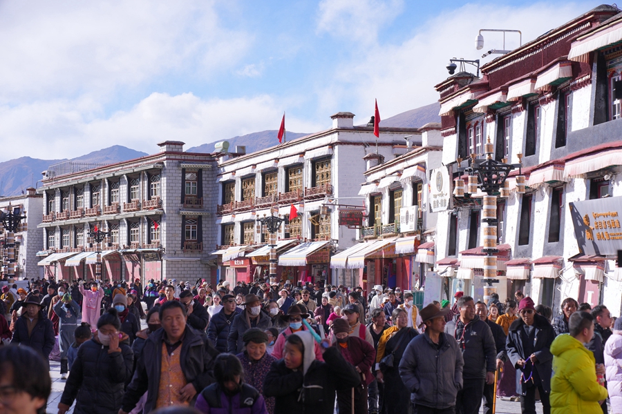 當(dāng)春節(jié)和藏歷新年相遇,雪域高原天氣晴好,處處妝點(diǎn)著美麗。在自治區(qū)首府拉薩各處,來(lái)自祖國(guó)各地的游客與當(dāng)?shù)厝罕娫谶@里歡度新年、互道祝福語(yǔ)、同吃年夜飯、共唱吉祥歌,以特殊的方式共度新春佳節(jié)。