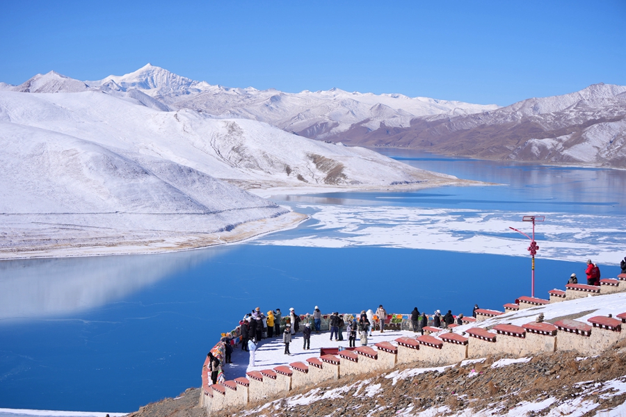 西藏三大圣湖之一的羊卓雍措湖,湖面結(jié)冰美不勝收,吸引了不少游客前來(lái)打卡觀賞。