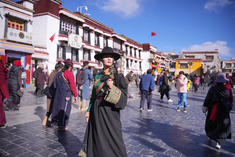 大年初二,身著民族服飾的年輕女子,在八廓街拍攝寫(xiě)真。