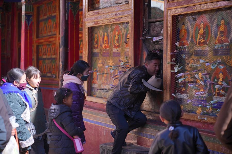 大年初六,山南地區(qū)澤當(dāng)鎮(zhèn)的雍布拉康,是松贊干布和文成公主的夏宮。游客來(lái)此登高遠(yuǎn)眺。
