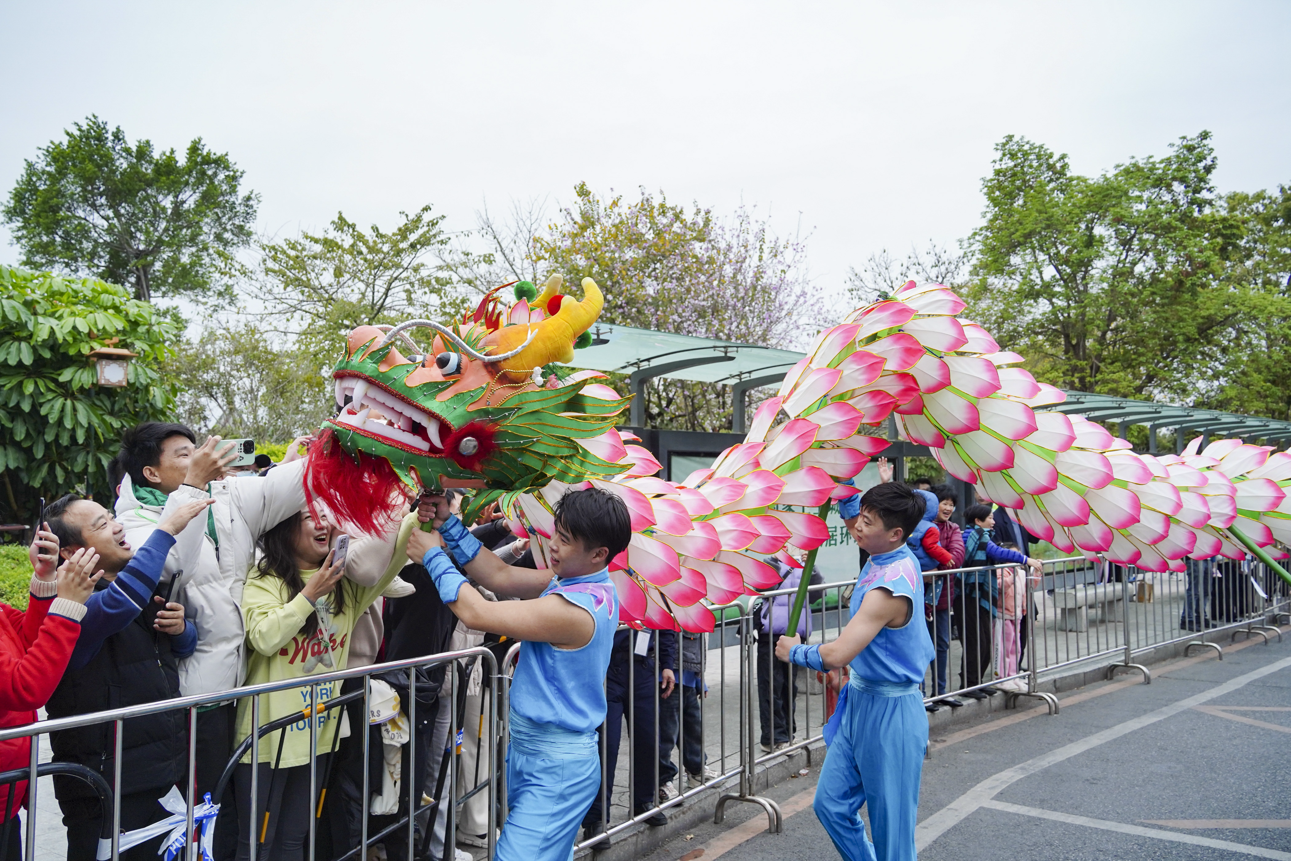 市民與舞龍隊(duì)互動。
