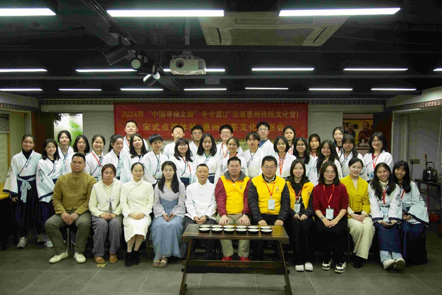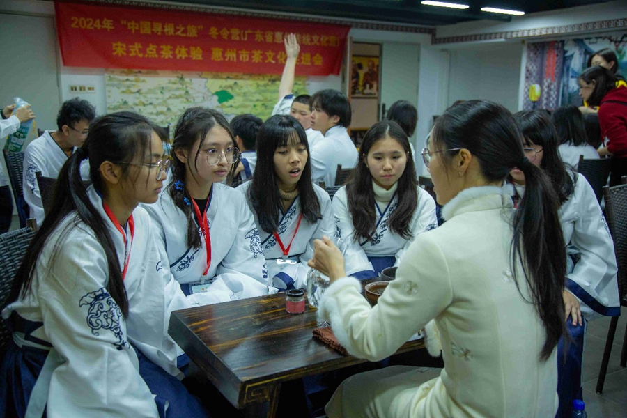 2月26日下午1時,惠州市優(yōu)茶集茶葉審評中心,來了一群身著漢服的學(xué)生。他們是2024年“中國尋根之旅”冬令營(廣東省惠州傳統(tǒng)文化營)的學(xué)生,都是來自馬來西亞。在高級點茶師的指導(dǎo)下,他們了解中國茶和宋式點茶的歷史,品嘗點茶,并且親身體驗了一番宋式點茶。