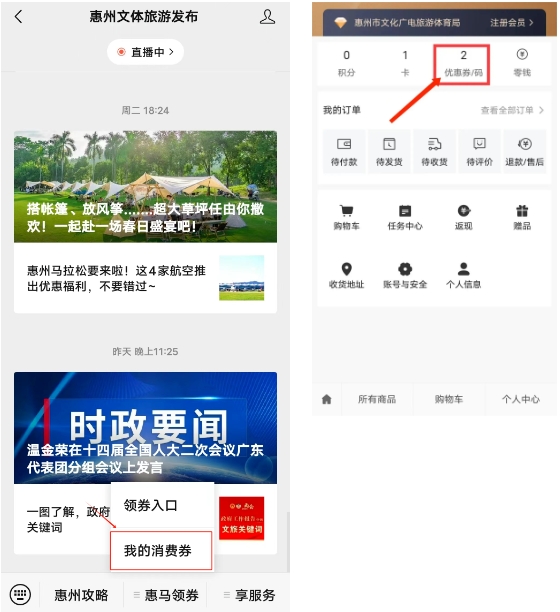 點(diǎn)擊“惠州文體旅游發(fā)布”公眾號底部菜單欄“惠馬領(lǐng)券”選擇“領(lǐng)券入口”,進(jìn)入活動頁面,使用中簽手機(jī)號碼授權(quán)登錄,點(diǎn)擊“領(lǐng)取”即可。