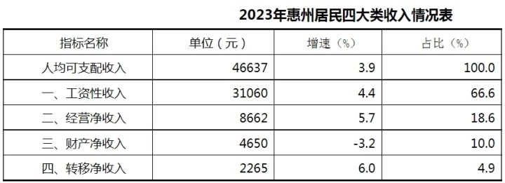 調(diào)查數(shù)據(jù)顯示,2023年,惠州居民的四大收入中,除財產(chǎn)性凈收入外,其余的工資性收入、經(jīng)營凈收入和轉(zhuǎn)移凈收入均實現(xiàn)了增加。