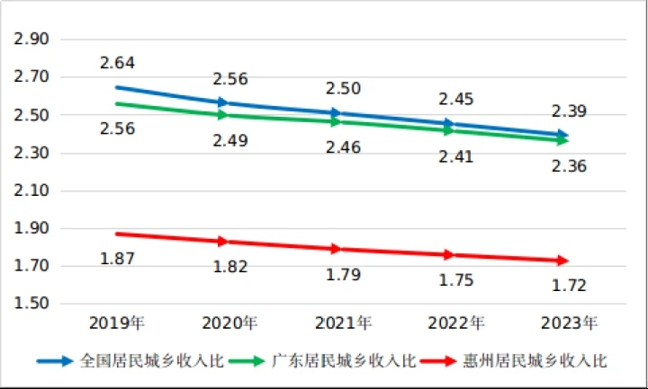 近五年惠州城鄉(xiāng)居民收入比與全國、廣東情況對比圖