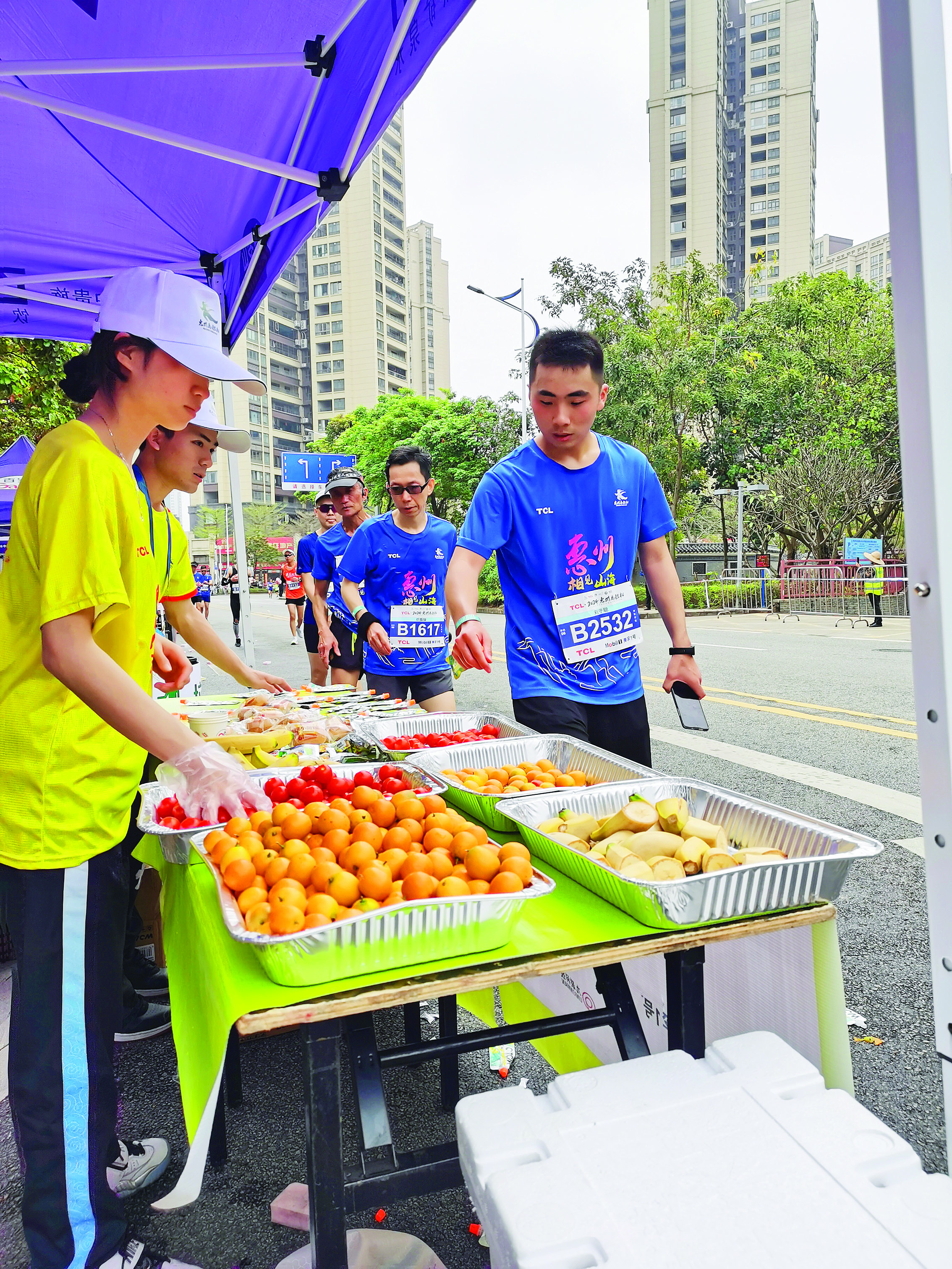 惠州馬拉松沿線為選手提供豐富的補(bǔ)給。