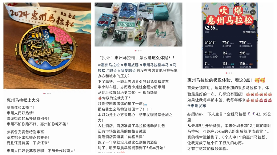 不少參賽選手在各大社交媒體上表揚(yáng)惠州的用心服務(wù),“惠州馬拉松贏麻了,組委會安排免費(fèi)半日游,以后‘惠馬’我都報(bào)!薄盎葜蓠R拉松上大分,惠州人民好熱情,沿途補(bǔ)給站特別多,惠州不怕你跑不好,就怕你吃不飽!”“參賽包、完賽包特別豐富,挑不出槽點(diǎn),下次還來!”……