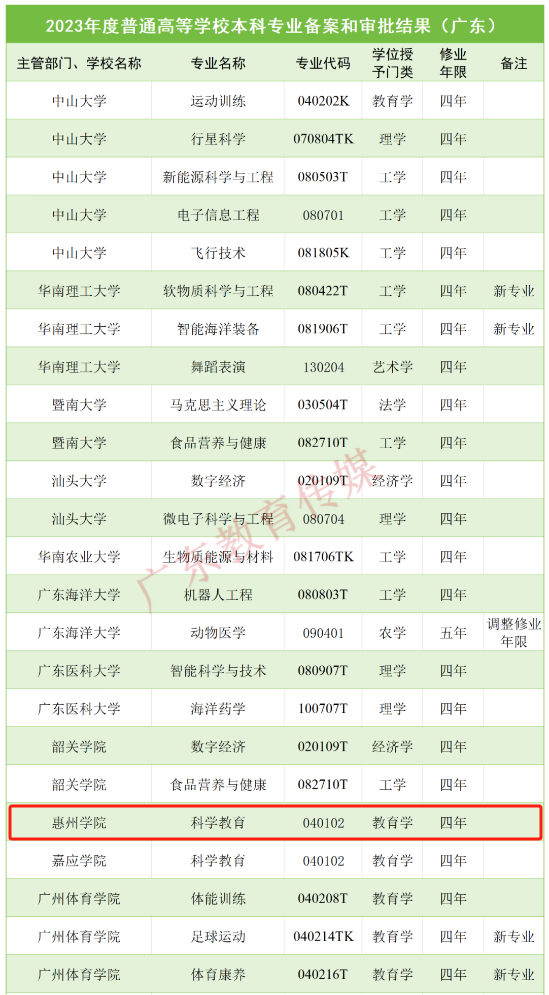 據(jù)統(tǒng)計(jì),廣東高校新增備案和審批的本科專業(yè)共89個(gè),調(diào)整學(xué)位授予門類或修業(yè)年限專業(yè)3個(gè)。其中,惠州學(xué)院新增“科學(xué)教育”專業(yè),專業(yè)代碼040102,修業(yè)年限四年,學(xué)位授予門類為教育學(xué)。2024年起,即可進(jìn)行高考招生。