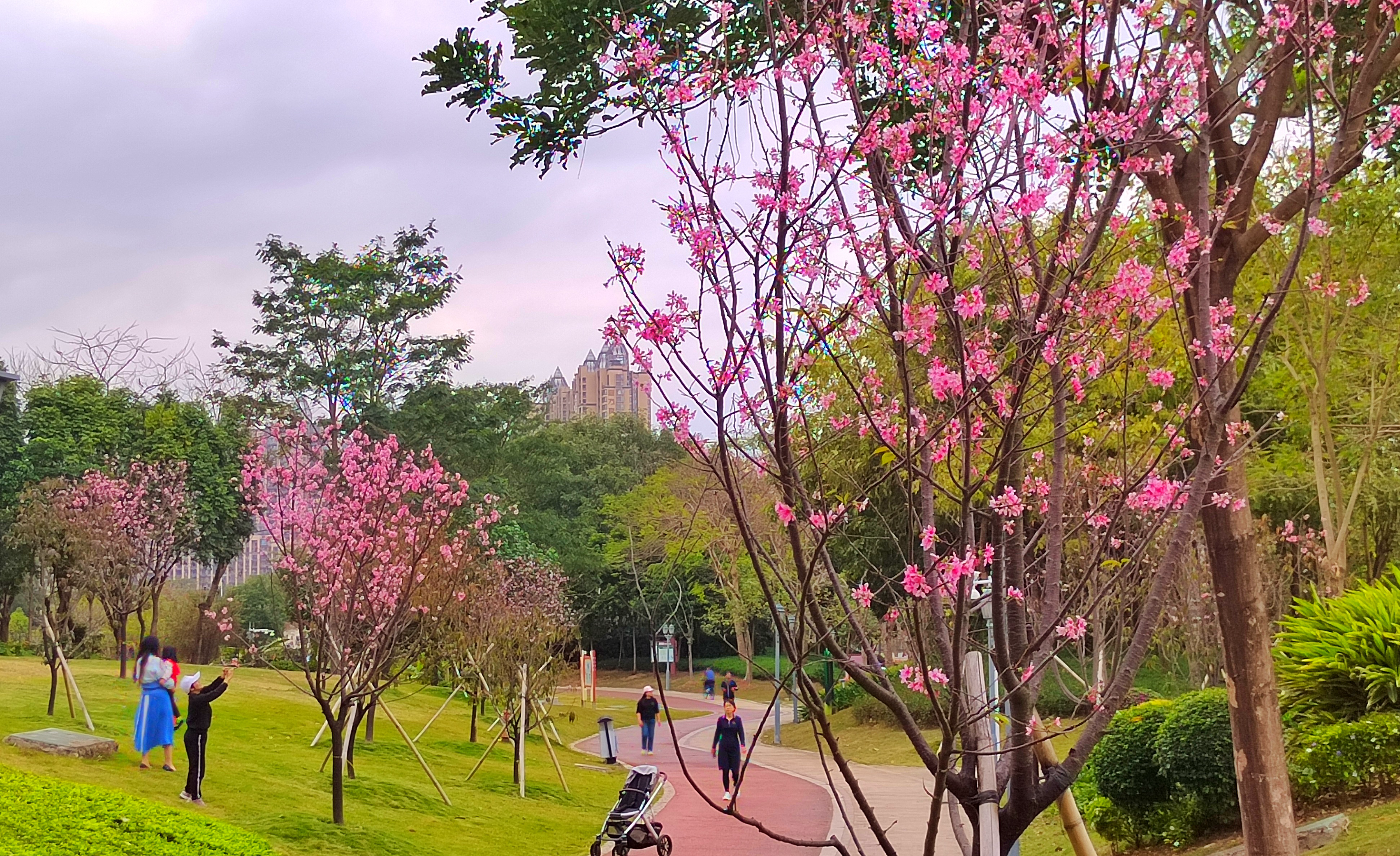 金山湖公園工作人員介紹,櫻花是落葉喬木,在溫暖的華南地區(qū)會呈現(xiàn)半落葉狀態(tài)。櫻花綻放時(shí),花開滿天,花團(tuán)錦簇,如云似霞、滿樹爛漫,深受人們喜愛。
