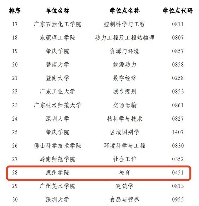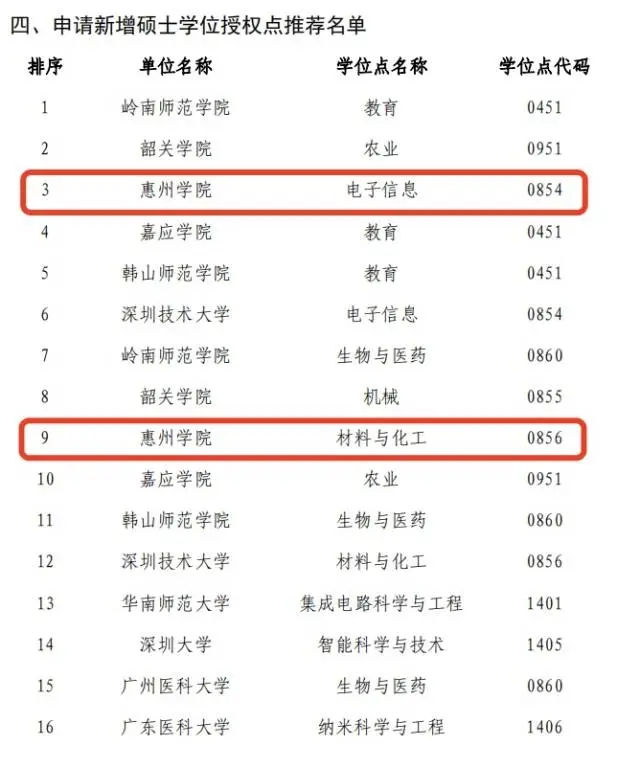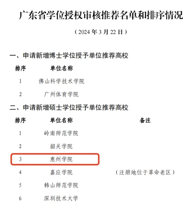 3月22日,廣東省教育廳公示新增博士碩士學位授權審核推薦名單和排序情況。其中,惠州學院入選廣東申請新增碩士學位授予單位推薦高校,排名第3。該校電子信息、材料與化工、教育入選廣東申請新增碩士學位授權點推薦名單,三個學位點排序依次為第3、第9、第28。