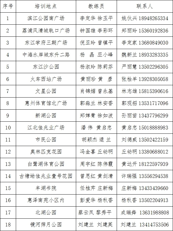 惠州日報訊 (記者龔妍 譚琳 通訊員劉澤華)記者日前從市文廣旅體局獲悉,惠州市第二十四屆太極拳活動月即將啟動,4月1日至30日期間,市太極拳協(xié)會將在全市設(shè)置18個教學點,免費為市民傳授國家體育總局編制的24式太極拳、健身氣功一套;顒訒r間為每天早上7時至8時30分,感興趣的市民可報名參與(培訓地點和聯(lián)系方式見表格)。