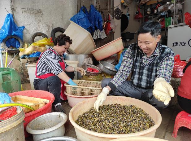 在沒有顧客的時(shí)候,小店主人黃顏鳳,低頭分揀剛到貨的東江蜆,將其分大小,然后盛放在鐵盆內(nèi),用清水沖洗。東江蜆隨著鐵盆轉(zhuǎn)動(dòng),沙沙作響,像在跳著歡快的舞曲。