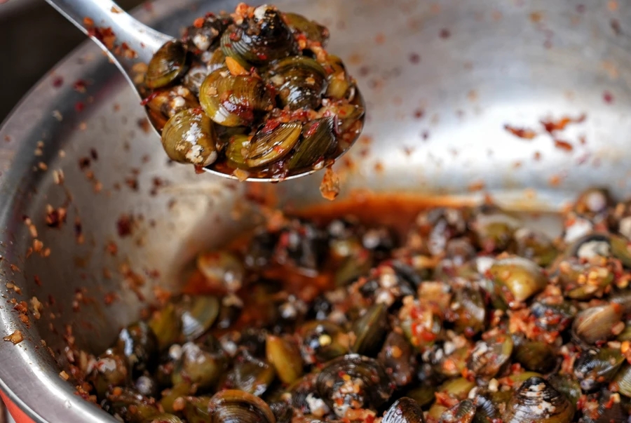 東江蜆普遍個(gè)大,貝殼色呈金黃,肉質(zhì)白色透明。店內(nèi)大門口,擺放著多盆東江蜆供來往顧客挑選、購(gòu)買。除了成品東江蜆,還有幾盆蜆肉、腌蜆,方便市民選購(gòu),其中的腌蜆更是可以直接食用,是一道風(fēng)味小吃。