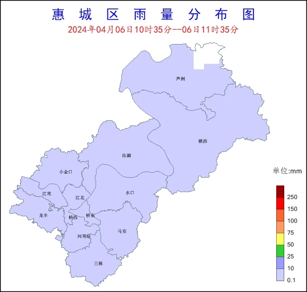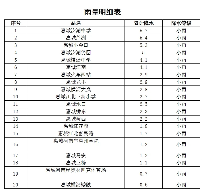 統(tǒng)計數(shù)據(jù)顯示,5日17時至6日17時,我市共有雨量站180個,全部站點出現(xiàn)降水。全市平均雨量31.7毫米,有4個站點錄得100~250毫米累積雨量,有17個站點錄得50~100毫米累積雨量,有70個站點錄得25~50毫米累積雨量,各縣區(qū)最大降水量(單位:毫米)分別為:龍門永漢南昆山130.3、大亞灣三門島62.4、博羅公莊官山59、惠城汝湖中學37.9、惠東巽寮29.6、仲愷潼湖24.4、惠陽平潭陽光23.1。