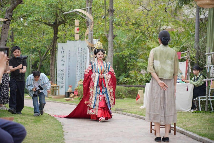 “祥云東起青龍上,朱雀玄武迎新娘!边M(jìn)入宋婚禮儀展示環(huán)節(jié),新郎新娘身著華麗喜服,按照宋代禮儀,一步步完成莊重的婚禮,現(xiàn)場(chǎng)賓客仿佛目睹了一場(chǎng)跨越時(shí)空的奇妙婚禮,不少人感慨:真是一秒穿越的浪漫!