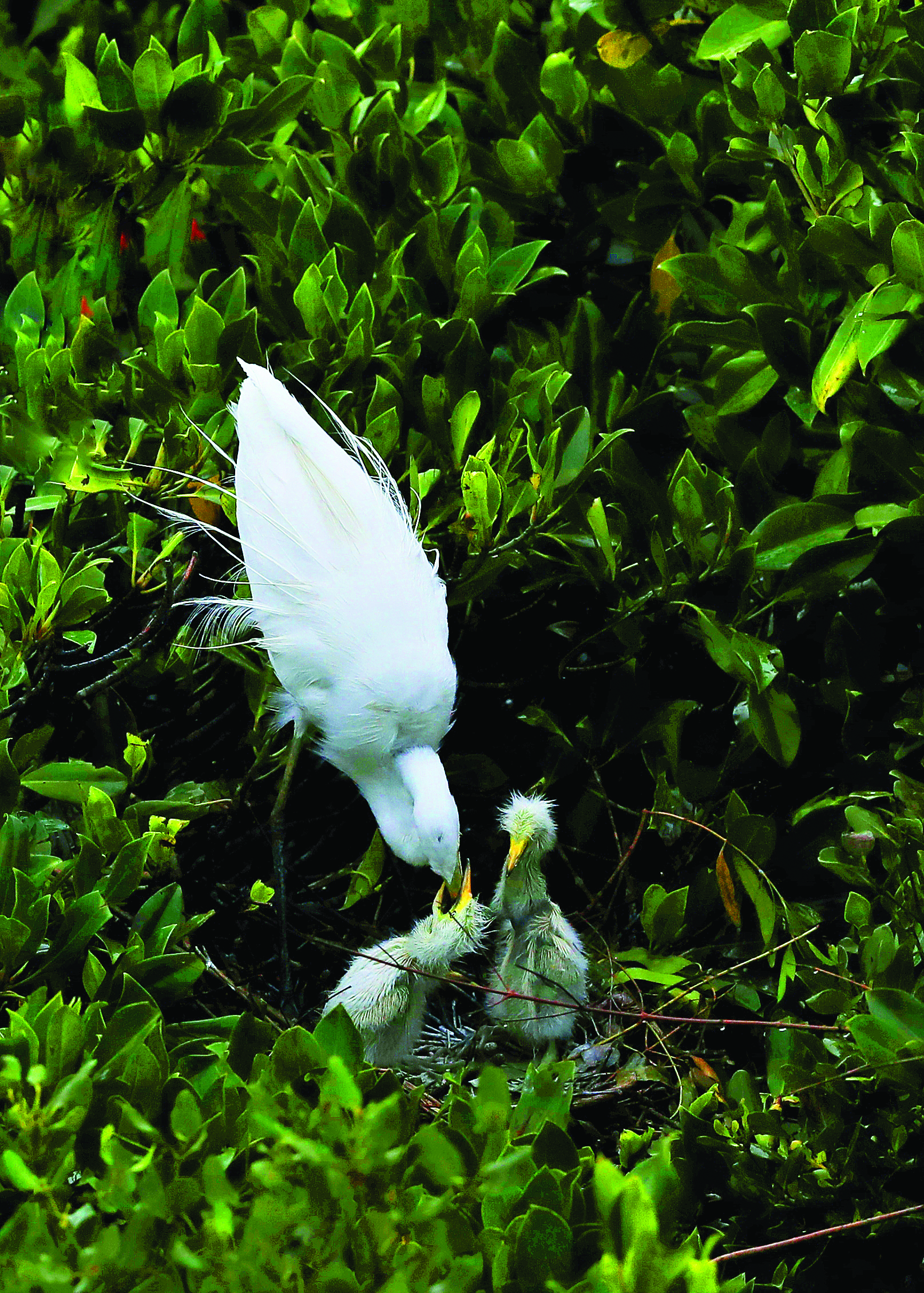嗷嗷待哺的鷺鳥寶寶美美地吃上一頓大餐。