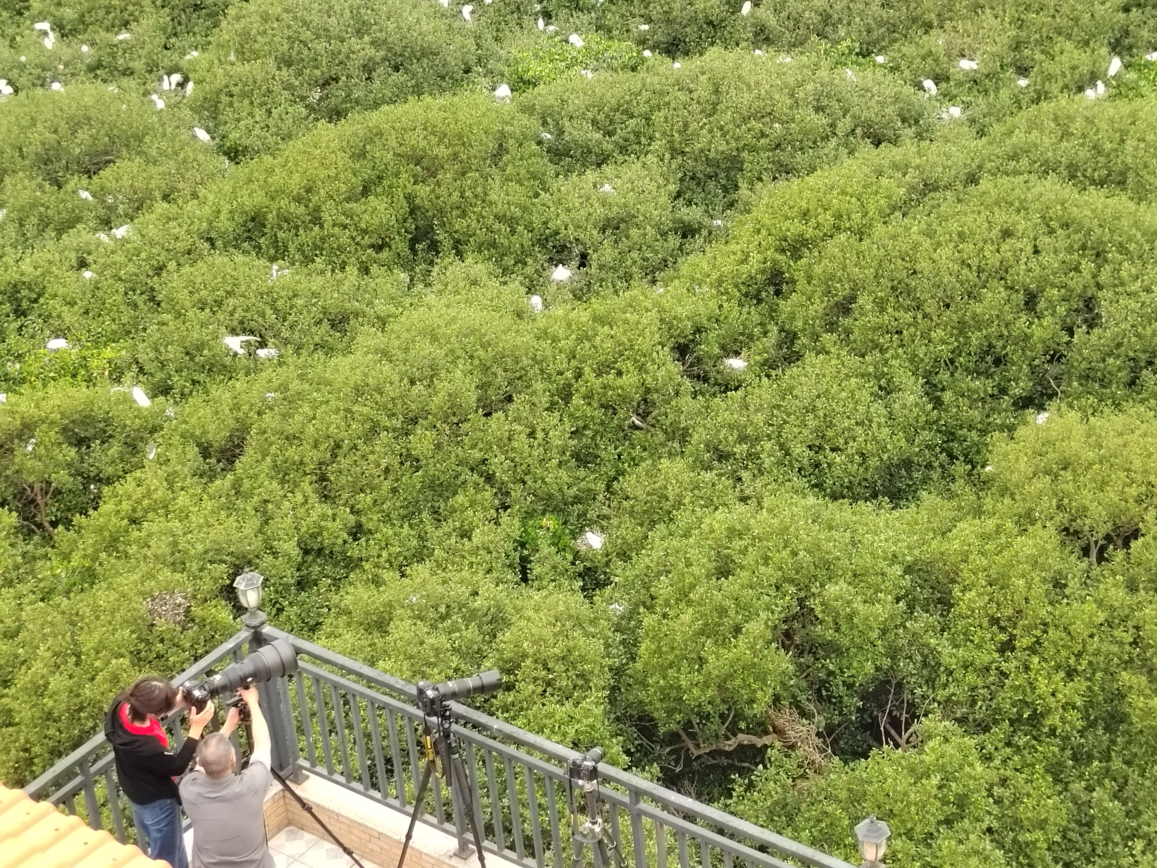 攝影愛好者在拍攝棲息紅樹林枝頭的鷺鳥。