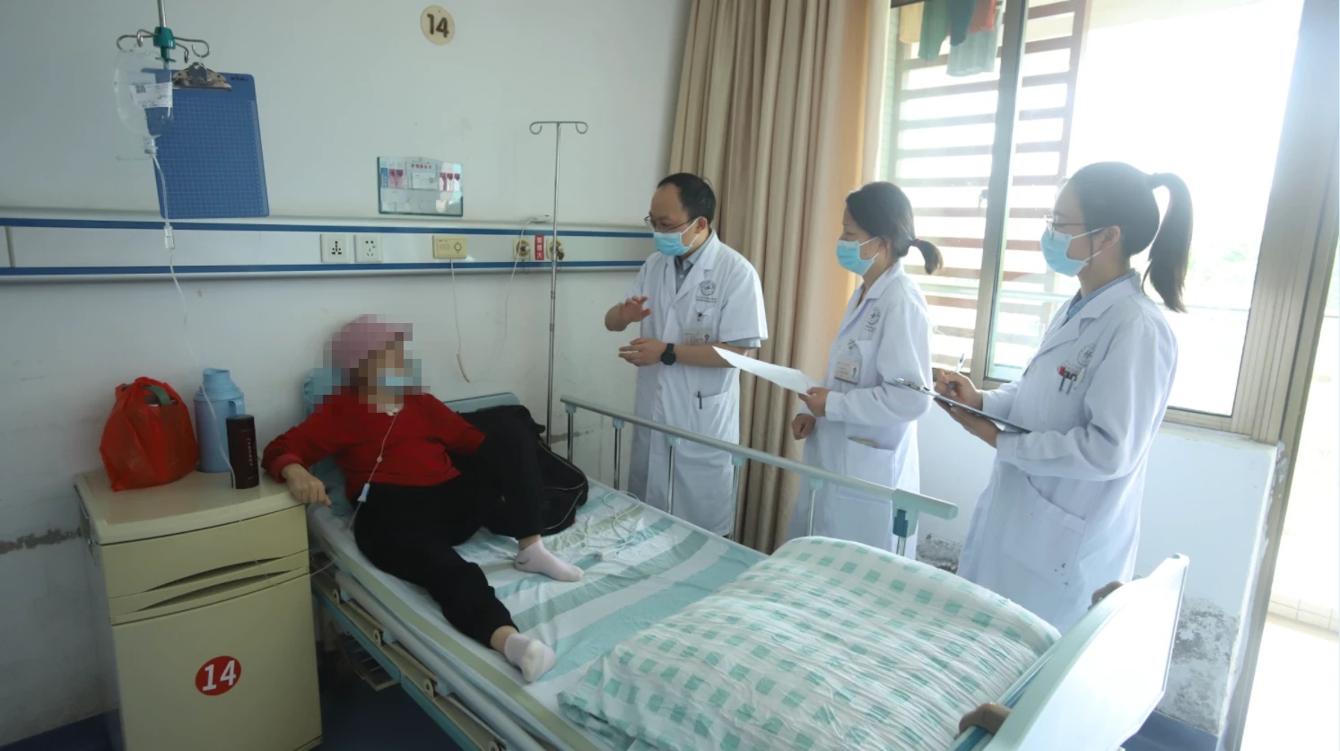 4月10日,惠州市人民中心醫(yī)院醫(yī)護(hù)人員查房,向患者了解病情。