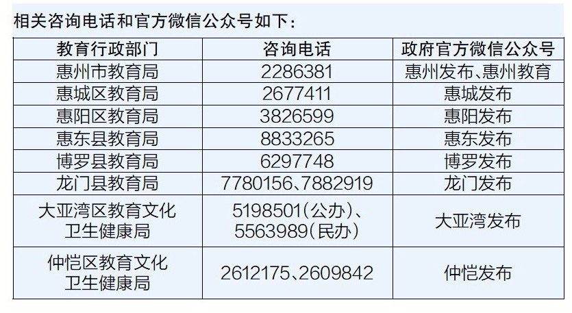 ●根據(jù)屬地管理責(zé)任,惠州市義務(wù)教育階段招生由各縣(區(qū))政府負(fù)責(zé),具體招生政策由縣(區(qū))教育行政部門(mén)擬定并負(fù)責(zé)解釋?zhuān)姓猩、招生流程及政策解讀等招生信息均以官方微信公眾號(hào)發(fā)布信息為準(zhǔn)。