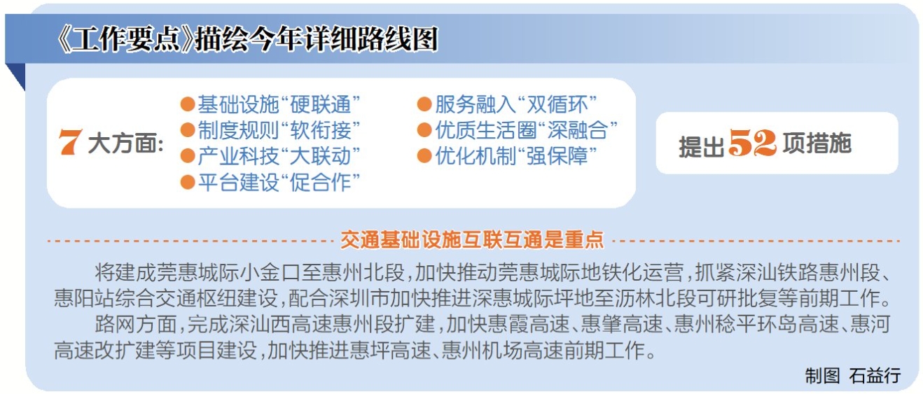 在大灣區(qū),惠州如何進(jìn)一步強(qiáng)化東部樞紐門戶地位?《工作要點(diǎn)》描繪了今年的詳細(xì)路線圖,聚焦基礎(chǔ)設(shè)施“硬聯(lián)通”、制度規(guī)則“軟銜接”、產(chǎn)業(yè)科技“大聯(lián)動(dòng)”、平臺建設(shè)“促合作”、服務(wù)融入“雙循環(huán)”、優(yōu)質(zhì)生活圈“深融合”、優(yōu)化機(jī)制“強(qiáng)保障”等七大方面,提出了52項(xiàng)措施,并明確了相應(yīng)的責(zé)任單位進(jìn)行落實(shí)。