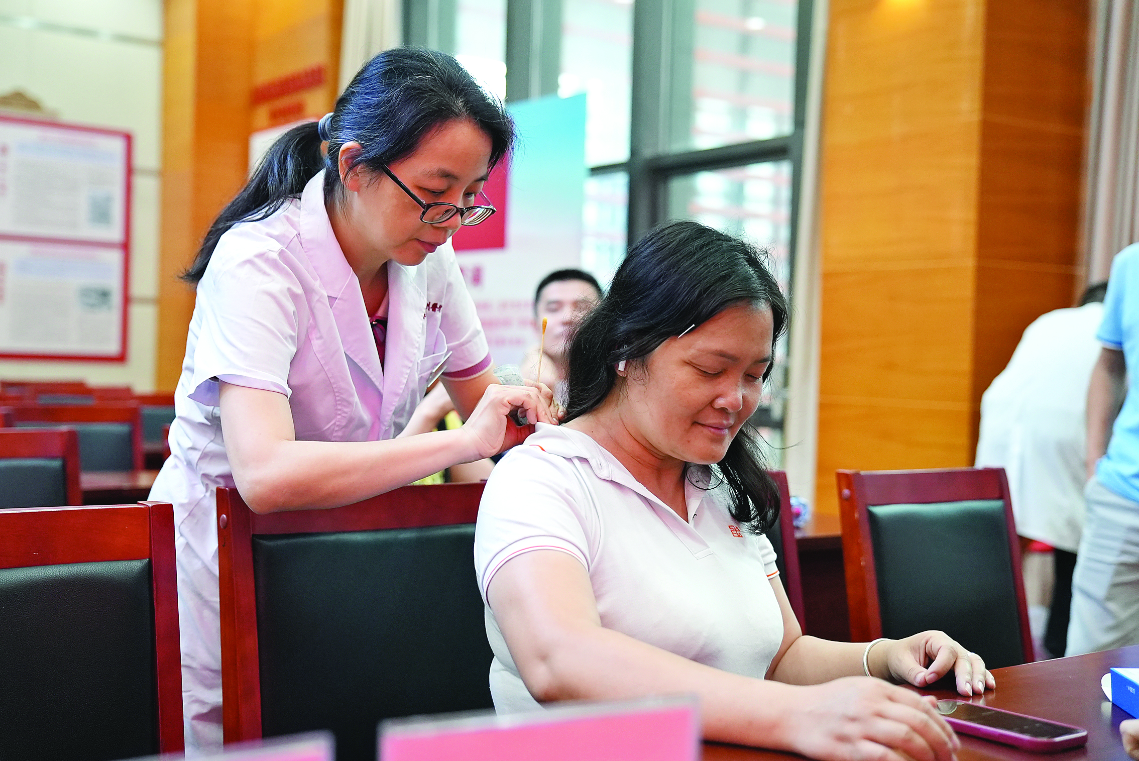 活動(dòng)現(xiàn)場(chǎng),市中醫(yī)醫(yī)院醫(yī)務(wù)人員為惠州日?qǐng)?bào)社員工開展中醫(yī)藥健康宣講及義診活動(dòng)!皼]有生病,就要先防了!贬t(yī)院專家表示,歷代醫(yī)家乃至現(xiàn)代醫(yī)學(xué)對(duì)“治未病”非常重視,平時(shí)可以結(jié)合個(gè)人體質(zhì)進(jìn)行調(diào)養(yǎng),“未病先防”。專家提醒,廣東氣候溫暖潮濕,濕熱體質(zhì)的人可以通過飲食、運(yùn)動(dòng)、藥物等方式調(diào)養(yǎng)身體,在日常生活中應(yīng)注意飲食清淡,少吃刺激性的食物,多吃綠豆、薏仁、冬瓜等清熱利濕的食物,平時(shí)可以通過運(yùn)動(dòng)的方式,將體內(nèi)多余的濕氣排出體外。醫(yī)務(wù)人員還為大家進(jìn)行了艾灸、針灸、推拿和刮痧等。