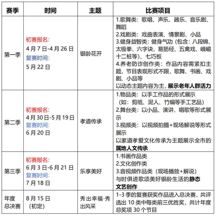 根據(jù)官方發(fā)布的賽季活動內(nèi)容,第一季的主題是“銀齡花開”,比賽項(xiàng)目主要涵蓋歌舞類、戲劇類、健身益智類、養(yǎng)老防詐創(chuàng)作類等不同類型,以動態(tài)主題內(nèi)容為主,表現(xiàn)方式豐富多樣,致力于展示老年人群的風(fēng)采和活力;第二季則圍繞“孝道傳承”的主題,比賽項(xiàng)目涵蓋手工作品類、舞臺表演類、視頻拍攝+現(xiàn)場解說等類型,以家道孝愛文化傳承為主要內(nèi)容,展示惠州獨(dú)特的屬地人文傳承;第三季以“樂享美好”為主題,比賽項(xiàng)目以靜態(tài)文藝創(chuàng)作為主,包括書畫作品、文化創(chuàng)作、音視頻作品等形式,與時俱進(jìn)歌頌美好銀齡生活;最受矚目的總決賽以“秀出幸!ば愠鲲L(fēng)采”為主題,對前三季的優(yōu)秀作品進(jìn)行總評選,最終得出年度總獎項(xiàng)。