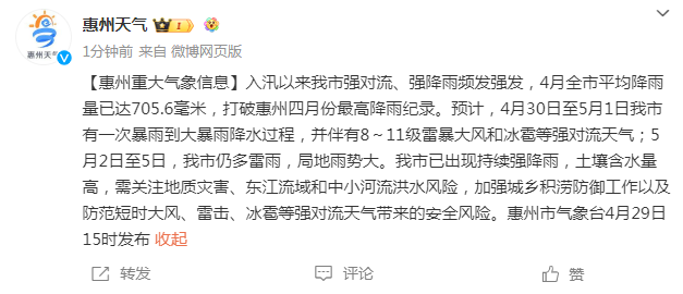 惠州市氣象臺(tái)4月29日15時(shí)發(fā)布惠州重大氣象信息