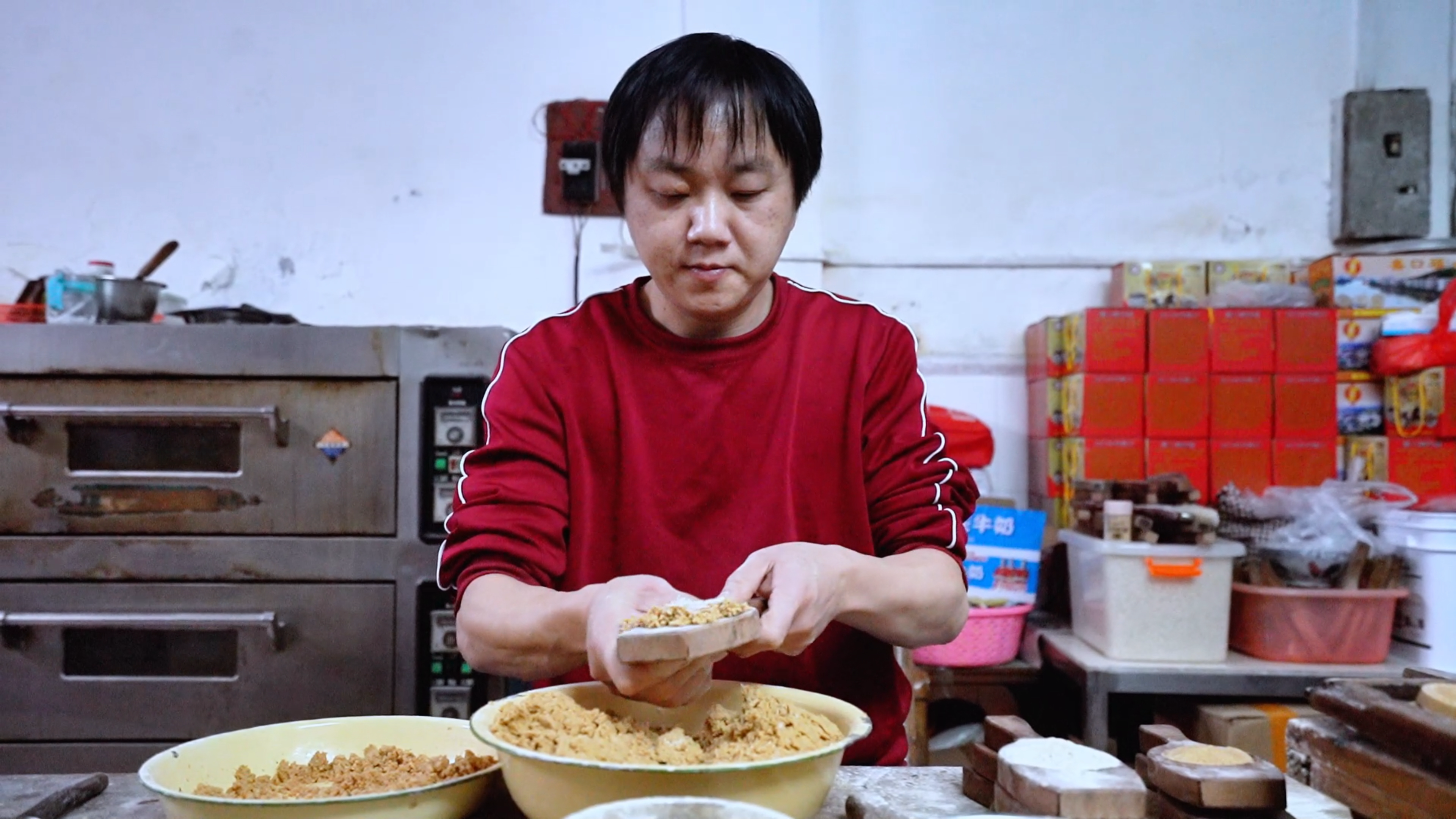 羅偉亮介紹,制作米餅時,把米粉、花生、鹽、糖等餡料有序壓進餅?zāi)@,再用餅錘對餅?zāi)U磧擅孢M行捶打。只見他先把放有餡料的一面用餅錘打?qū),使餡料充分壓入餅?zāi)#纬蓤D案。隨后,多次敲打餅?zāi)1趁,使米餅脫出?