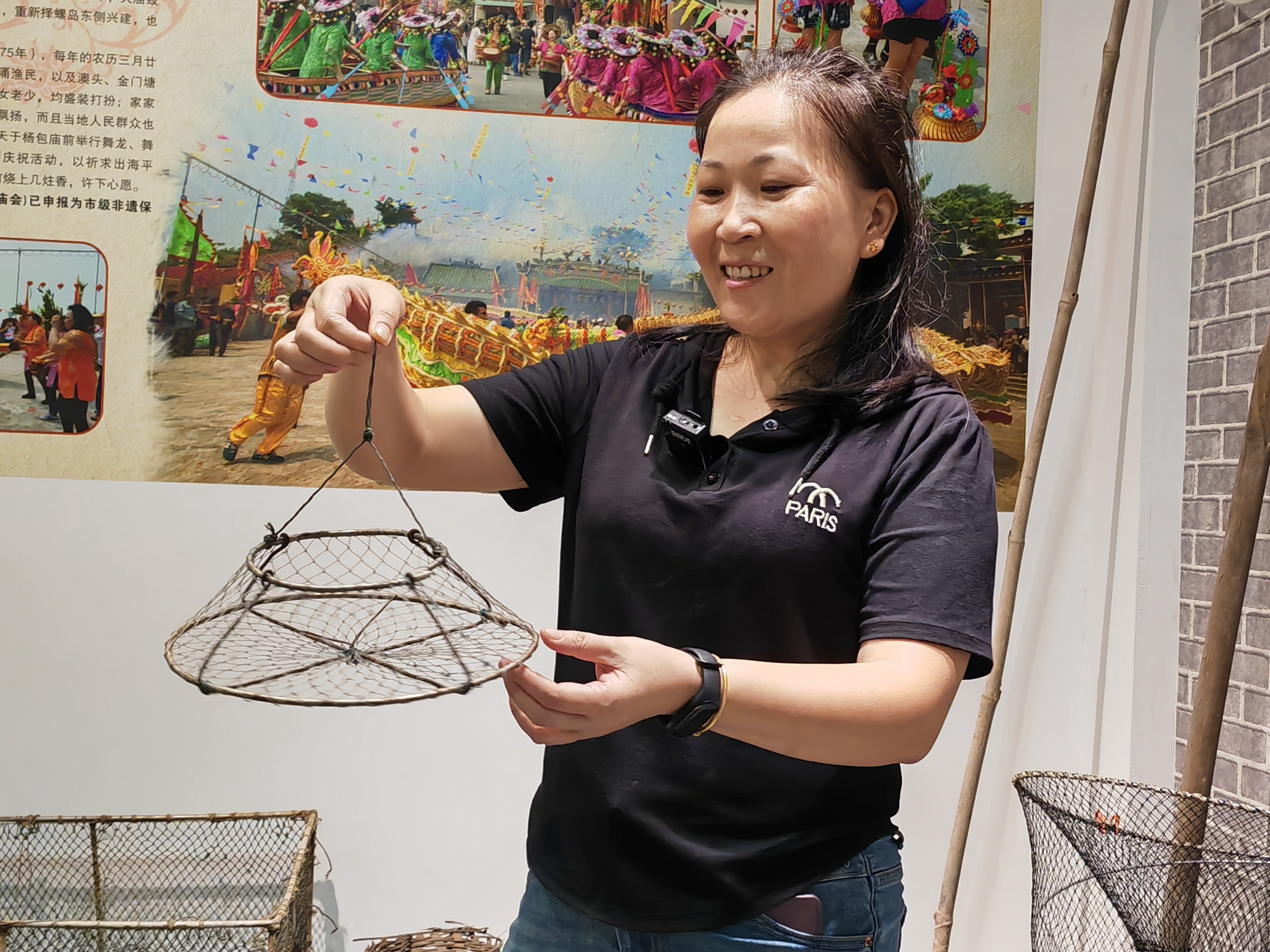 你瞧!這個是石螺籠,它是過去漁民在海里抓石螺、花螺時用的工具,外形像一個鐵絲扎的圓形燈籠,上面寬口,底部和四周是細密的網(wǎng)格。石螺籠子中間有一條鐵絲,漁民用腌制好的咸魚插在鐵絲上做誘餌。霞涌街道文化站工作人員張明妹介紹,出海抓石螺時,漁民用一根長長的線,把多個石螺籠串起來沉到海底,等待一夜后收網(wǎng),籠子里便有收獲:石螺、花螺乖乖地待在籠子里了。