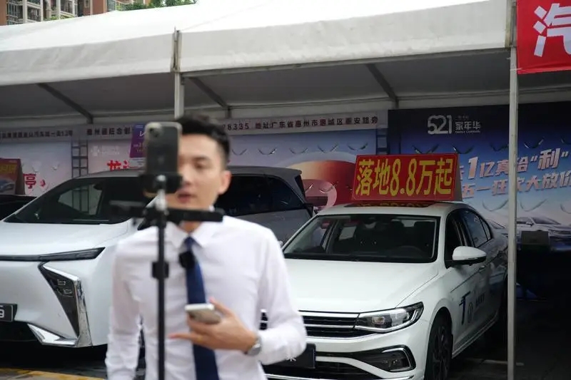 惠陽“五一”車展現(xiàn)場,汽車銷售正在直播。
