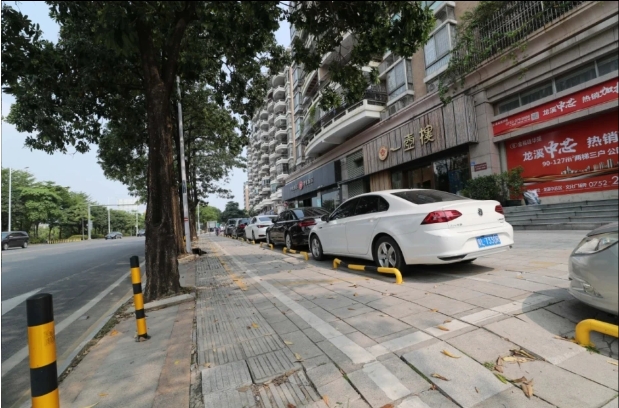 市區(qū)江北東江一路,通過止車杠將人行道、盲道隔離。