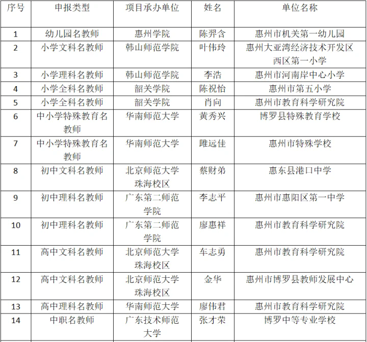 近日,廣東省教育廳公布廣東省中小學“百千萬人才培養(yǎng)工程”省級培養(yǎng)項目(2024-2026年)培養(yǎng)學員名單,共有518名學員入選,其中惠州有19人。他們將接受為期三年的培養(yǎng),目標是成為教育家型的教師或書記校(園)長。