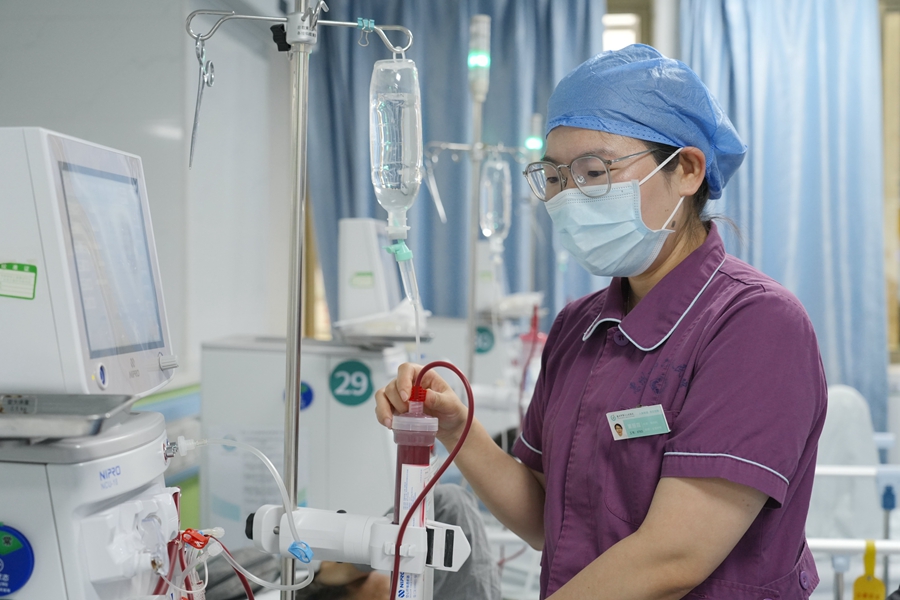 董麗霞給患者做透析治療。