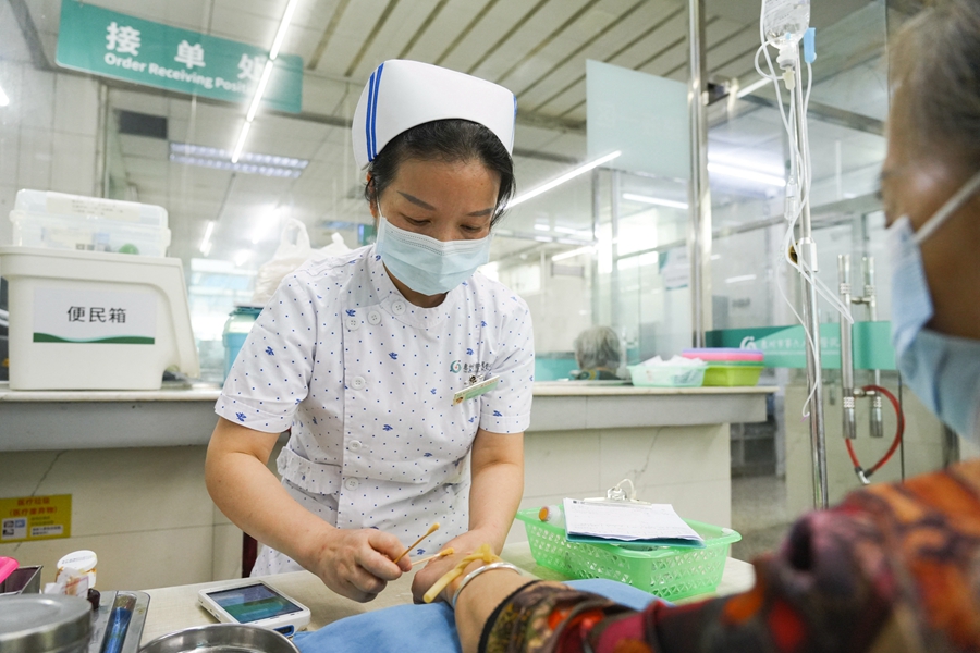 長期的輸液工作平凡又瑣碎,如何保持熱情和干勁?熊春艷說,設(shè)身處地想想,患者很不容易,自己能夠理解他們的處境,想盡自己所能去幫助他們!爱斘铱匆娀颊呤稚响o脈穿刺成功回血的那一刻,成就感會油然而生!”熊春艷說,患者的一個小眼神,一句認可,都會讓自己動力十足。